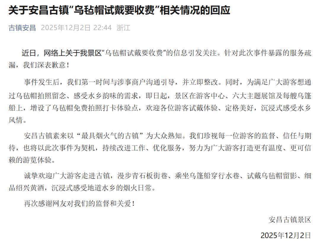 事件发生后,我们第一时间与涉事商户沟通引导,并立即整改。同时,为满足广大游客想通过乌毡帽拍照留念、感受水乡韵味的需求,即日起,景区在游客中心、六大主题展馆及每艘乌篷船上,增设了乌毡帽免费拍照打卡体验点,欢迎各位游客试戴体验、定格美好,沉浸式感受水乡风情。